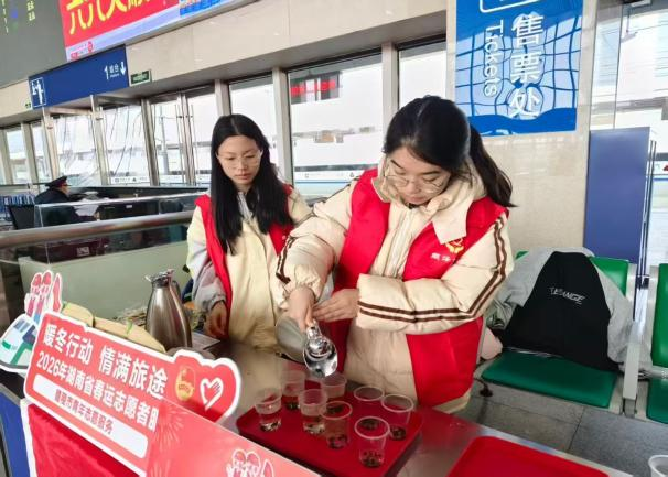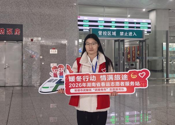 周杨灿在常德站参与春运“暖冬行动”志愿服务,负责秩序维护、出行咨询及便民服务,以认真负责的态度坚守岗位,用热情与细致温暖旅客归途,在实践中展现青年风采。